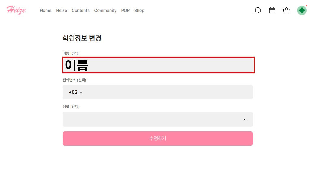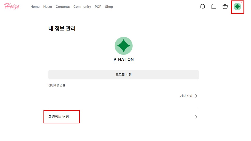 - 헤이즈(Heize) 공식 팬 커뮤니티 우측 상단의 프로필을 클릭해 내 정보 관리 페이지 > 회원정보 변경 > 이름 확인